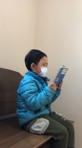 待合室で一文字ひともじ丁寧に読む息子。宮崎 みなみ