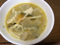 お汁は、ほうとう風に。カボチャ、玉ねぎ、頂き物の乾麺を茹でた物、里芋、生椎茸………昨晩の残りだけど、カボチャがいいし里芋がおいし~~い❣️*\(^o^)/*