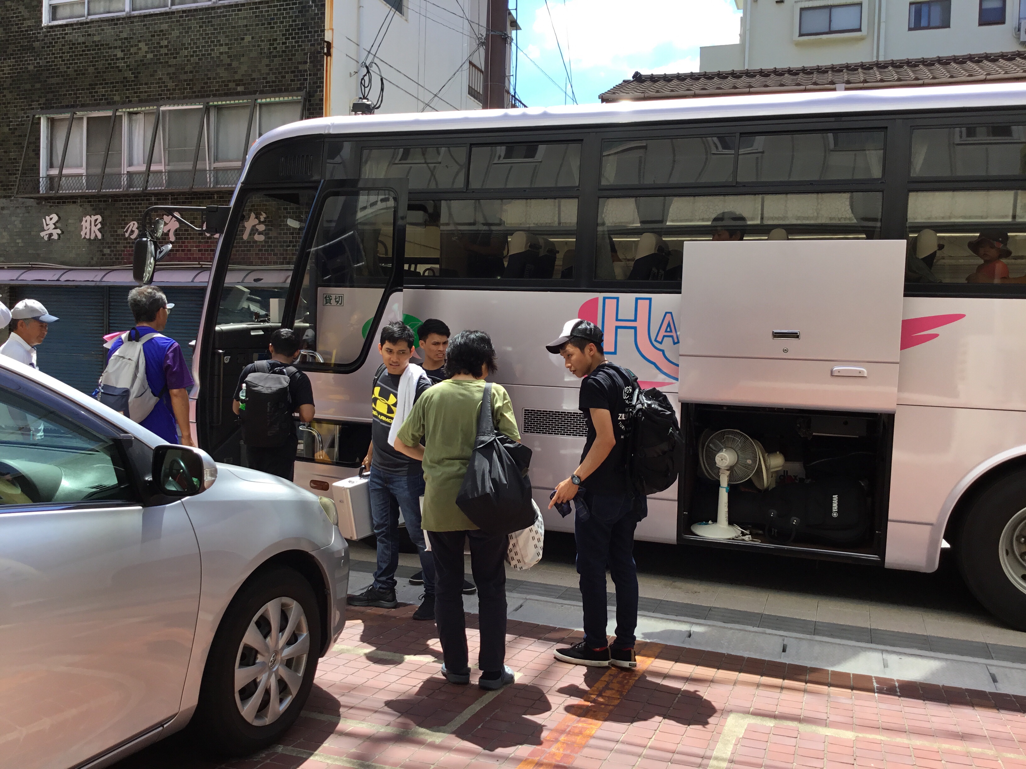 バスに乗り込んでいます。