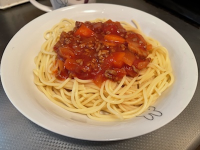 お昼はスパゲティミートソースを作りました。