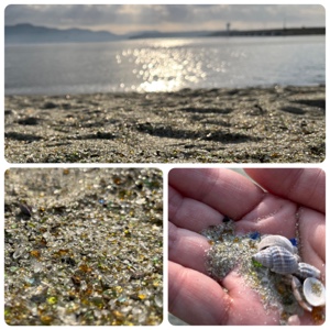 長崎空港そばにガラスの砂浜があります。2016年に長崎県が大村湾の水質改善のため、廃ガラス再生砂を用いて造成した浅場です。貝殻も見つけました。