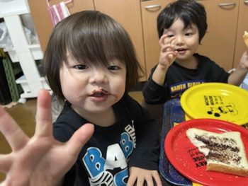 朝食です。食パンにチョコレートを塗って食べています。