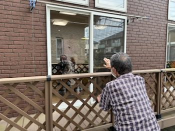 父と一緒に母の老人ホームへ。ガラス越しの面会です。
