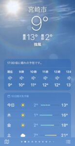 今日は晴れていますが、風が強いようです。宮崎 みなみ