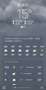 今朝は小雨が降っていますが、少しずつ晴れてくるようです。宮崎 みなみ