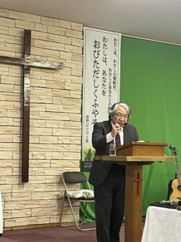 メッセージは、ローマ8:28、Iテサロニケ5:16~18節から、語られました。キャサリン・クールマンさんの「わたしは奇蹟を信じる」が、用いられました。