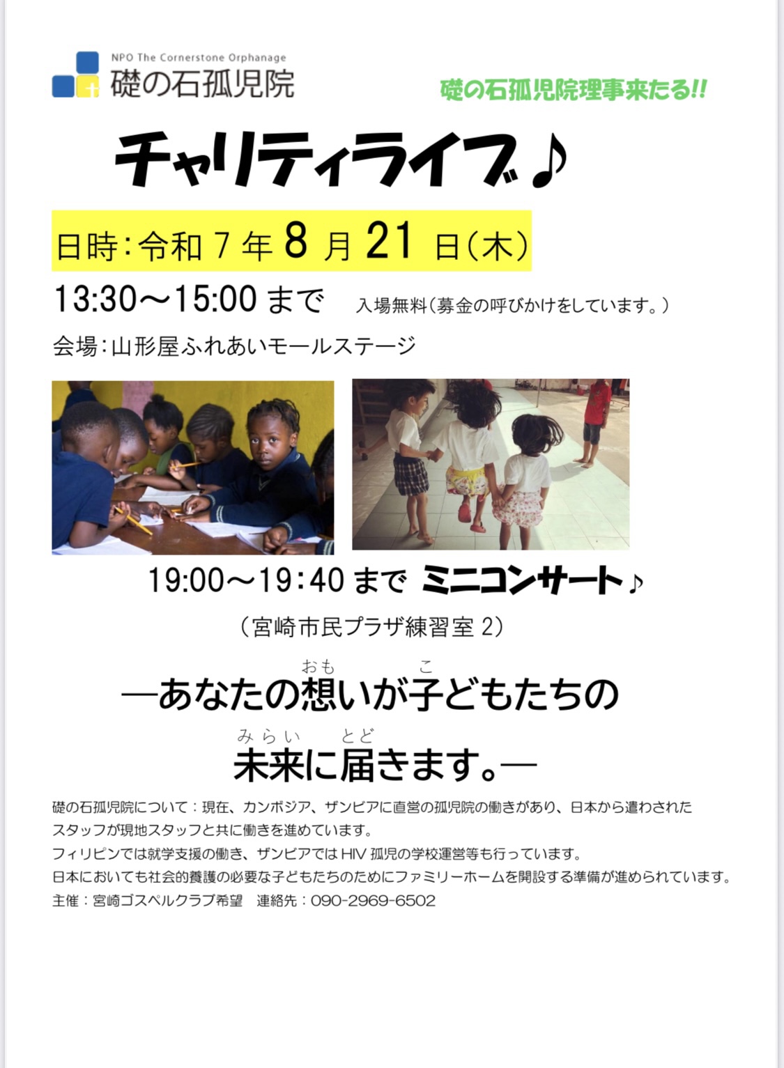 チャリティライブと聖会が行われます。ぜひお越しください。宮崎 みなみ