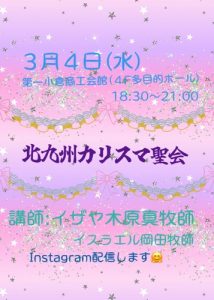今日は 2026-03-04 / hakubasynergoi 「北九州カリスマ聖会」が、行われます♪ お近くの方々、お越し下さいね。ぜひ❣️🤗 北九州 天の喜びの器ハンナ╰(*´︶`*)╯♡ 未分類 過去の投稿へ みことば