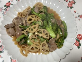 レンコンと豚塊肉を半分に切って………焼き肉のタレとみりん、蜂蜜🍯でお味付け✌️