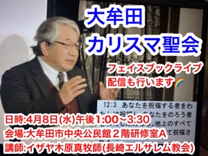 4月8日(水)午後1時より大牟田カリスマ聖会が行われます。会場は大牟田市中央公民館2階研修室Aです。講師は長崎エルサレム教会のイザヤ木原真牧師です。フェイスブックよりライブ配信します。主に期待してお集まりください。祝福がありますように\(^o^)/